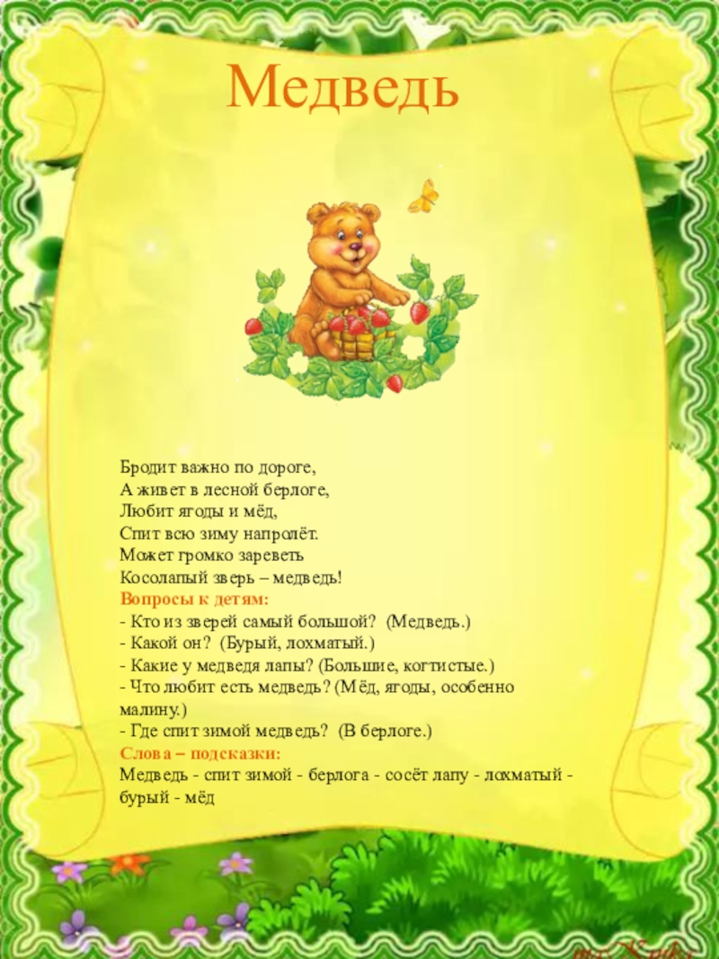Медведь - спит зимой - берлога - сосёт лапу - лохматый - бурый - мёд