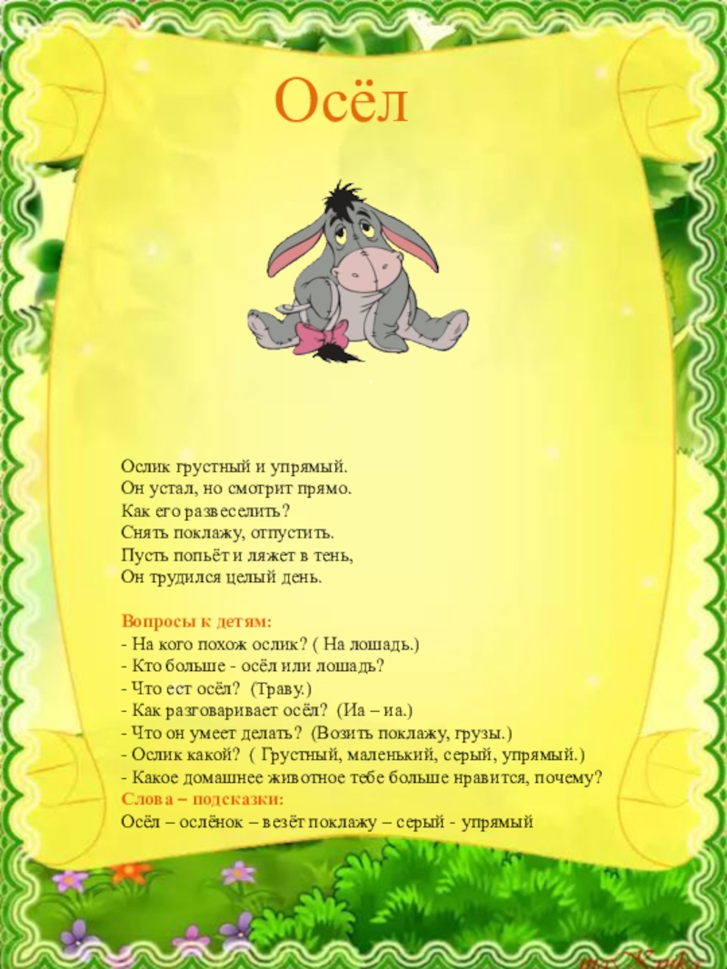 - Ослик какой? ( Грустный, маленький, серый, упрямый.)