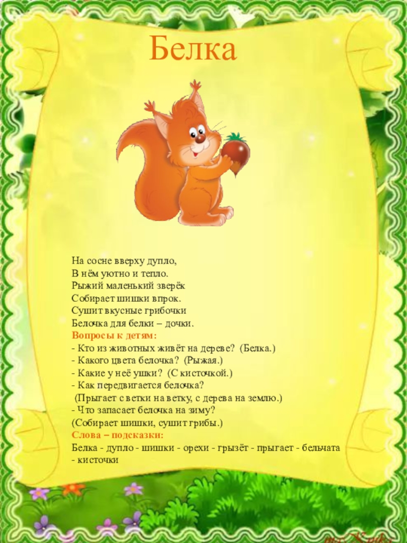 Белка - дупло - шишки - орехи - грызёт - прыгает - бельчата - кисточки