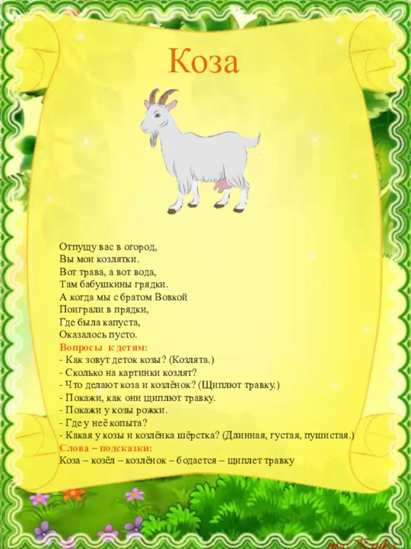Коза – козёл – козлёнок – бодается – щиплет травку