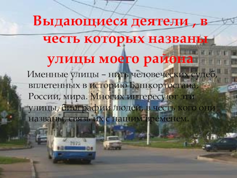 Именные улицы – нить человеческих судеб, вплетенных в историю Башкортостана, России, мира. Многих интересуют эти улицы, биографии людей, в честь кого они названы, связь их с нашим временем.