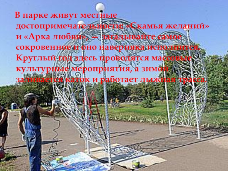 Слайд 19 В парке живут местные достопримечательности: «Скамья желаний» и «Арка