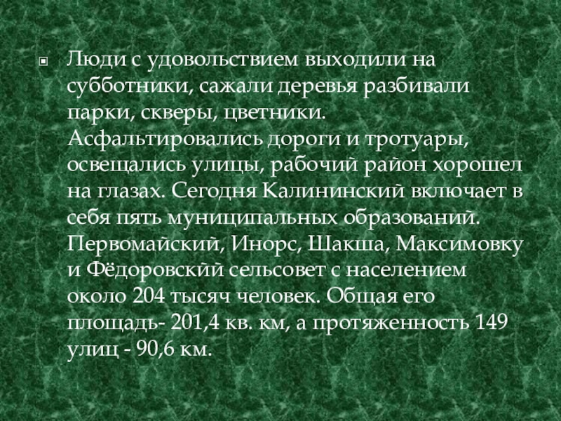 цветники. Асфальтировались дороги и тротуары, освещались улицы, рабочий район хорошел на глазах. Сегодня Калининский включает в себя пять муниципальных образований. Первомайский, Инорс, Шакша, Максимовку и Фёдоровскйй сельсовет с населением около 204 тысяч человек. Общая его площадь- 201,4 кв. км, а протяженность 149 улиц - 90,6 км.