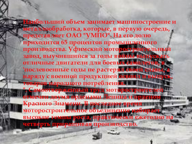 ОАО "УМПО". На его долю приходится 65 процентов промышленного производства. Уфимский моторостроительный завод, выучившийся за годы войны выпускать отличные двигатели для боевых самолетов, в 'послевоенные годы не растерял своей славы, а наряду с военной продукцией освоил и выпуск, товаров народного потребления. ". Самоотверженный труд моторостроителей отмечен двумя орденами Ленина и орденом Красного Знамени. В последнее время моторостроительное объединение набирает высокие темпы роста, практически ежегодно на четверть приращивая производство.