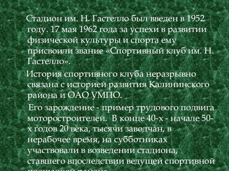 Слайд 23 Стадион им. Н. Гастелло был введен в 1952 году.
