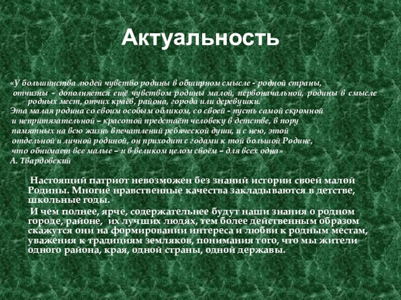 И чем полнее, ярче, содержательнее будут наши знания о родном городе, районе, их лучших людях, тем более действенным образом скажутся они на формировании интереса и любви к родным местам, уважения к традициям земляков, понимания того, что мы жители одного района, края, одной страны, одной державы.