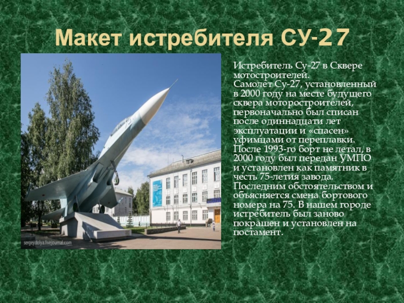 году на месте будущего сквера моторостроителей, первоначально был списан после одиннадцати лет эксплуатации и «спасен» уфимцами от переплавки. После 1993-го борт не летал, в 2000 году был передан УМПО и установлен как памятник в честь 75-летия завода. Последним обстоятельством и объясняется смена бортового номера на 75. В нашем городе истребитель был заново покрашен и установлен на постамент.