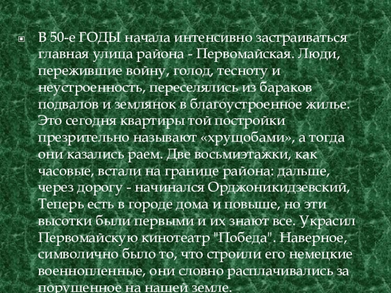 Люди, пережившие войну, голод, тесноту и неустроенность, переселялись из бараков подвалов и землянок в благоустроенное жилье. Это сегодня квартиры той постройки презрительно называют «хрущобами», а тогда они казались раем. Две восьмиэтажки, как часовые, встали на границе района: дальше, через дорогу - начинался Орджоникидзевский, Теперь есть в городе дома и повыше, но эти высотки были первыми и их знают все. Украсил Первомайскую кинотеатр "Победа". Наверное, символично было то, что строили его немецкие военнопленные, они словно расплачивались за порушенное на нашей земле.