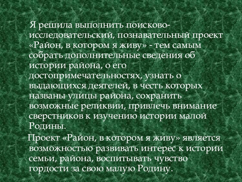 Слайд 4 Я решила выполнить поисково-исследовательский, познавательный проект «Район, в