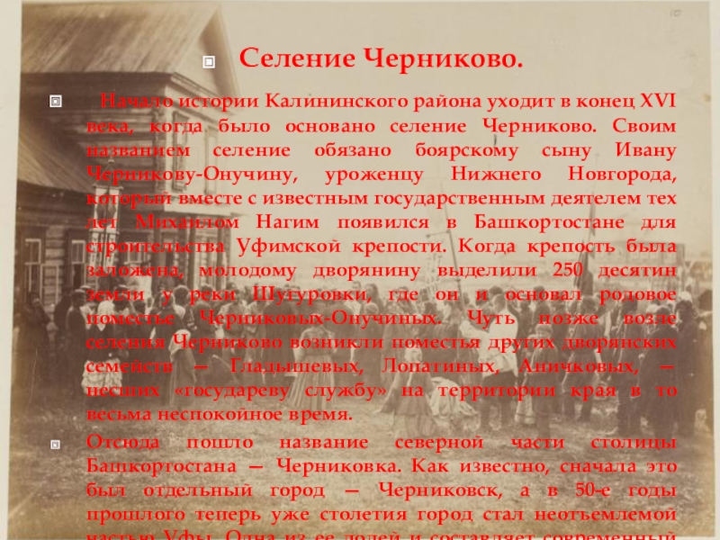 Отсюда пошло название северной части столицы Башкортостана — Черниковка. Как известно, сначала это был отдельный город — Черниковск, а в 50-е годы прошлого теперь уже столетия город стал неотъемлемой частью Уфы. Одна из ее долей и составляет современный Калининский район.