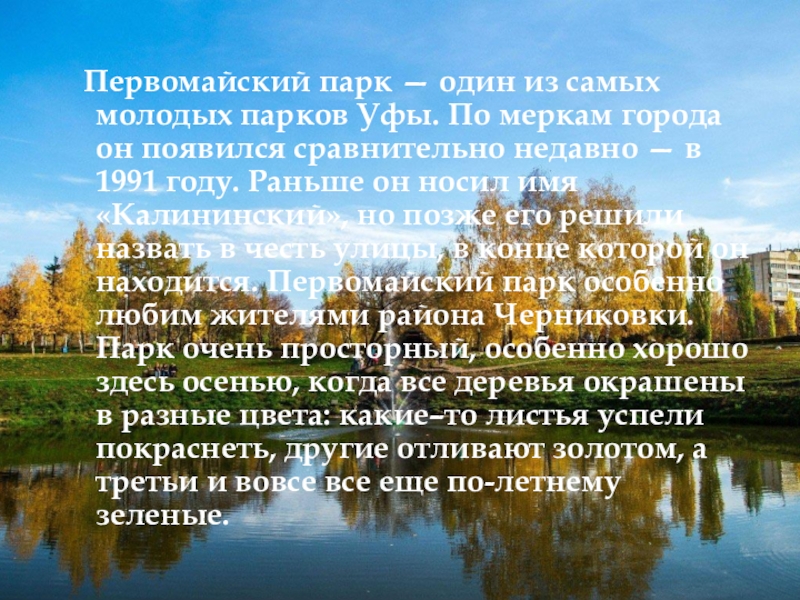 Слайд 18 Первомайский парк — один из самых молодых парков Уфы.