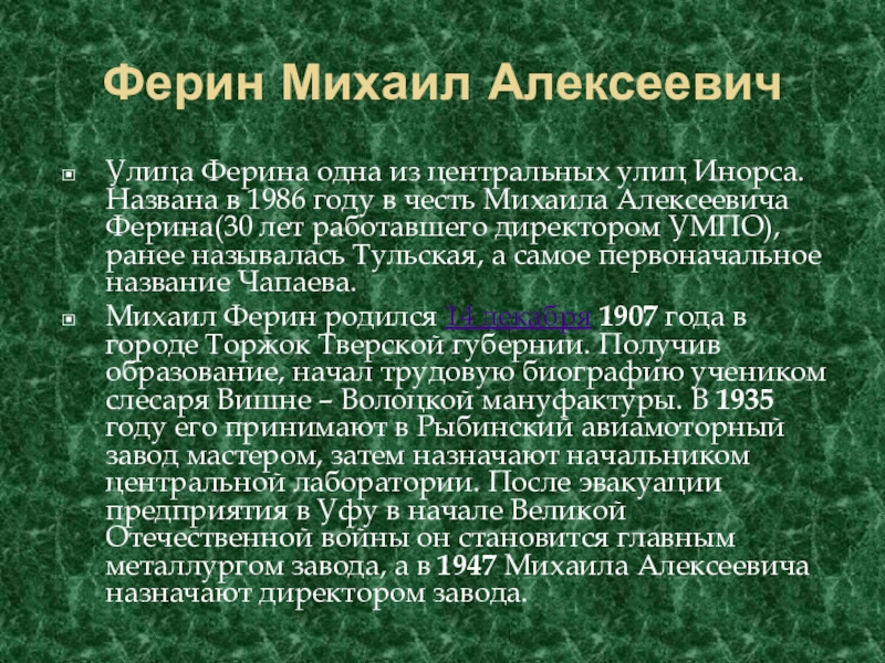 Михаил Ферин родился 14 декабря 1907 года в городе Торжок Тверской губернии. Получив образование, начал трудовую биографию учеником слесаря Вишне – Волоцкой мануфактуры. В 1935 году его принимают в Рыбинский авиамоторный завод мастером, затем назначают начальником центральной лаборатории. После эвакуации предприятия в Уфу в начале Великой Отечественной войны он становится главным металлургом завода, а в 1947 Михаила Алексеевича назначают директором завода.