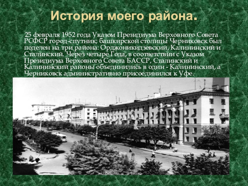 Президиума Верховного Совета РСФСР город-спутник; башкирской столицы Черниковск был поделен на три района: Орджоникидзевский, Калининский и Сталинский. Через четыре Года, в соответствии с Указом Президиума Верховного Совета БАССР, Сталинский и Калининский районы объединились в один - Калининский, а Черниковск административно присоединился к Уфе.