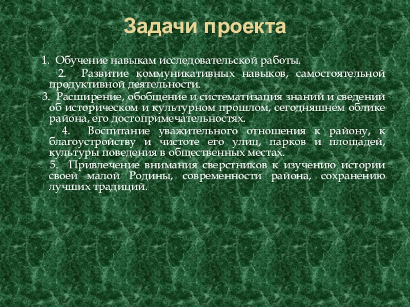 3. Расширение, обобщение и систематизация знаний и сведений об историческом и культурном прошлом, сегодняшнем облике района, его достопримечательностях.