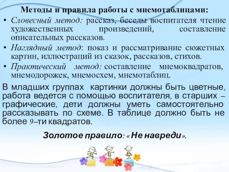 Слайд 12Методы и правила работы с мнемотаблицами: