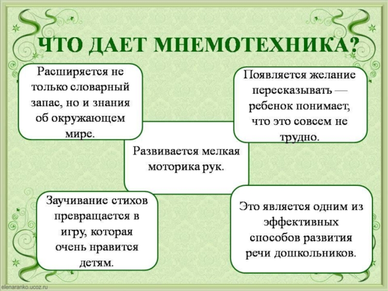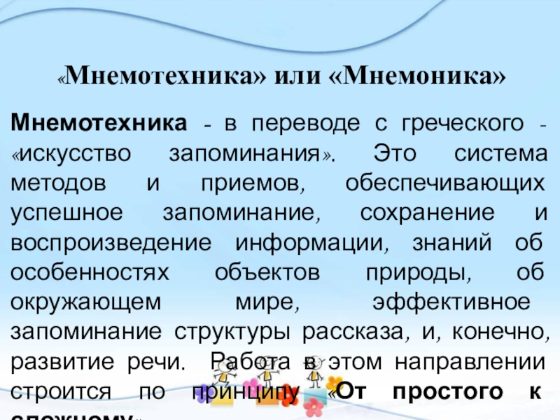 запоминания». Это система методов и приемов, обеспечивающих успешное запоминание, сохранение и воспроизведение информации, знаний об особенностях объектов природы, об окружающем мире, эффективное запоминание структуры рассказа, и, конечно, развитие речи. Работа в этом направлении строится по принципу «От простого к сложному»