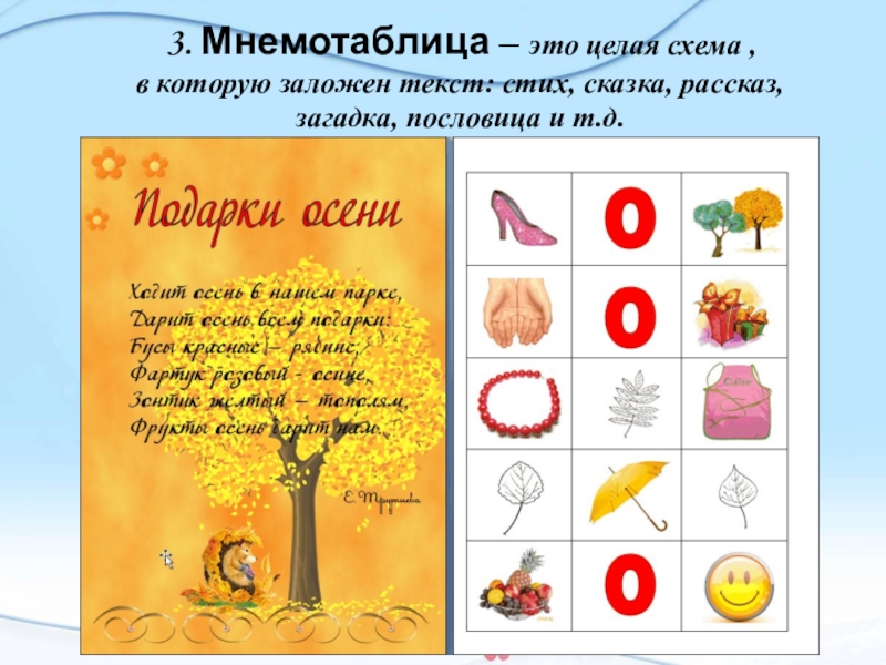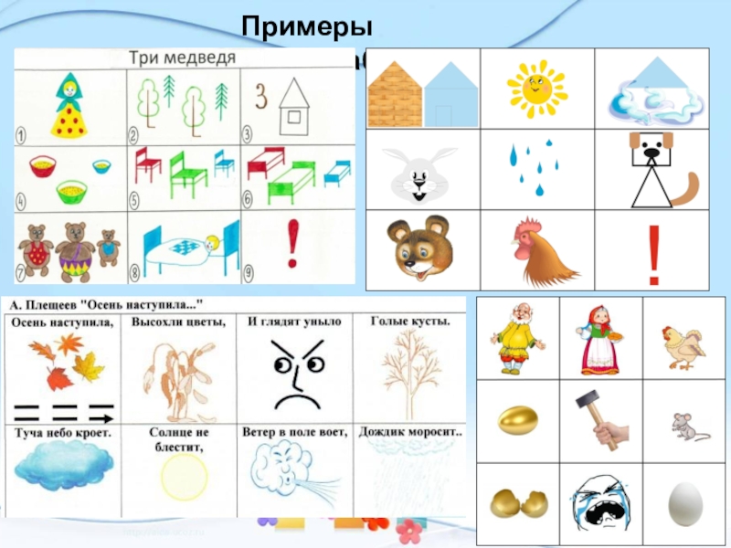 придумывается картинка (изображение); т. о. весь текст зарисовывается схематично. Глядя на эти схемы – рисунки ребёнок легко воспроизводит текстовую информацию.