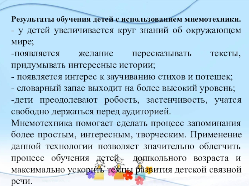 Слайд 21Результаты обучения детей с использованием мнемотехники.