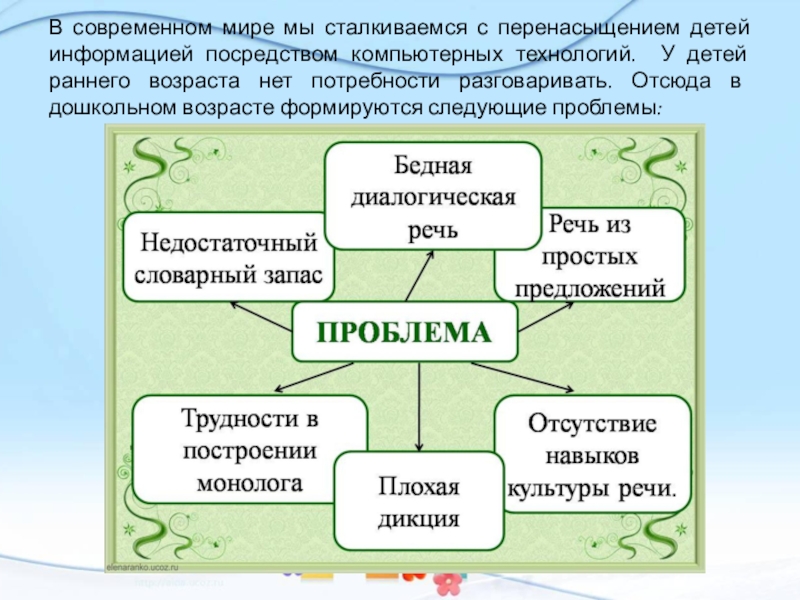 технологий. У детей раннего возраста нет потребности разговаривать. Отсюда в дошкольном возрасте формируются следующие проблемы: