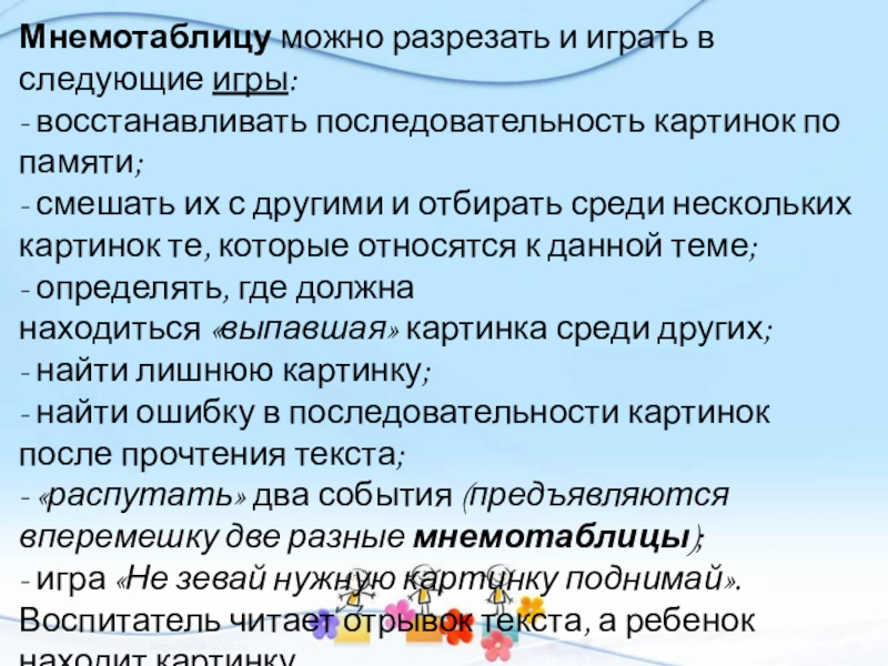 Слайд 15Мнемотаблицу можно разрезать и играть в следующие игры: