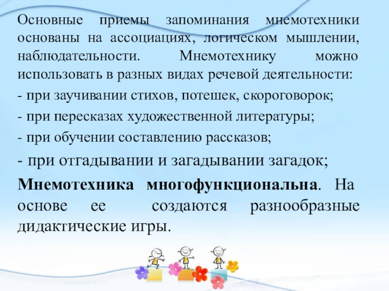 Основные приемы запоминания мнемотехники основаны на ассоциациях, логическом мышлении, наблюдательности.