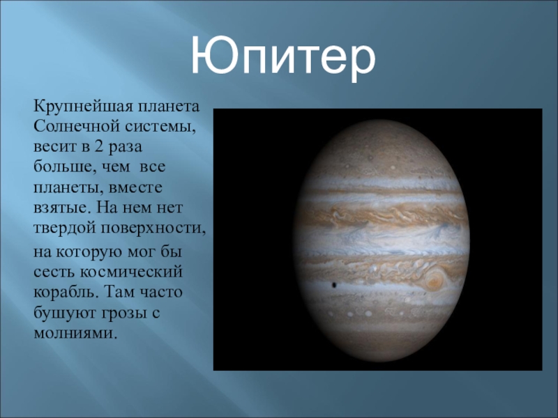 ЮпитерКрупнейшая планета Солнечной системы, весит в 2 раза больше, чем все планеты, вместе взятые. На нем нет