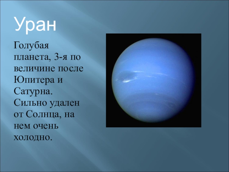 УранГолубая планета, 3-я по величине после Юпитера и Сатурна. Сильно удален от Солнца, на нем очень холодно.