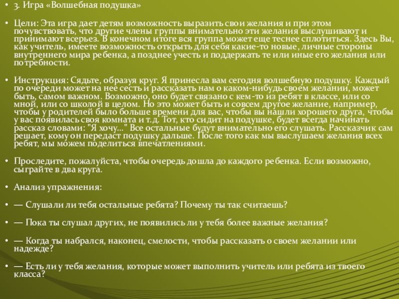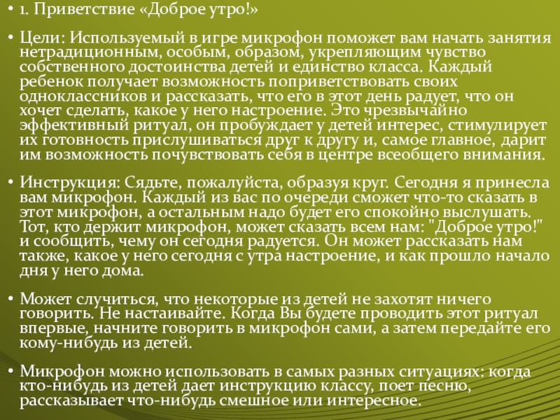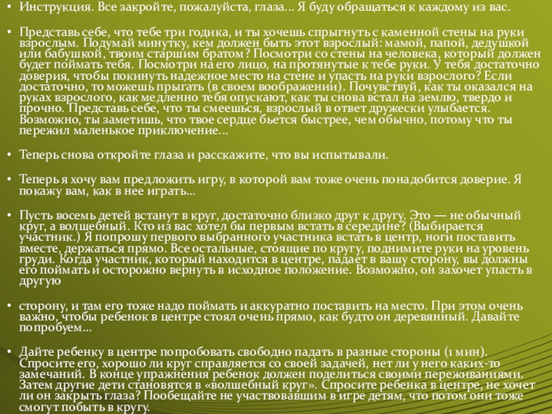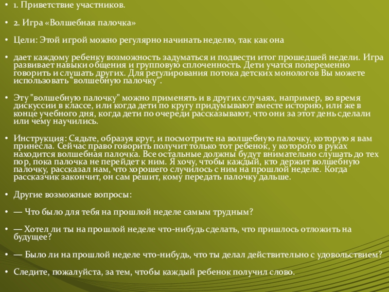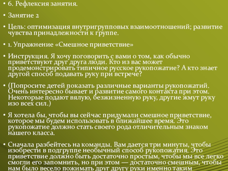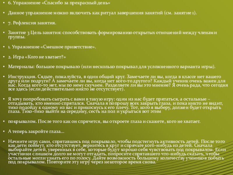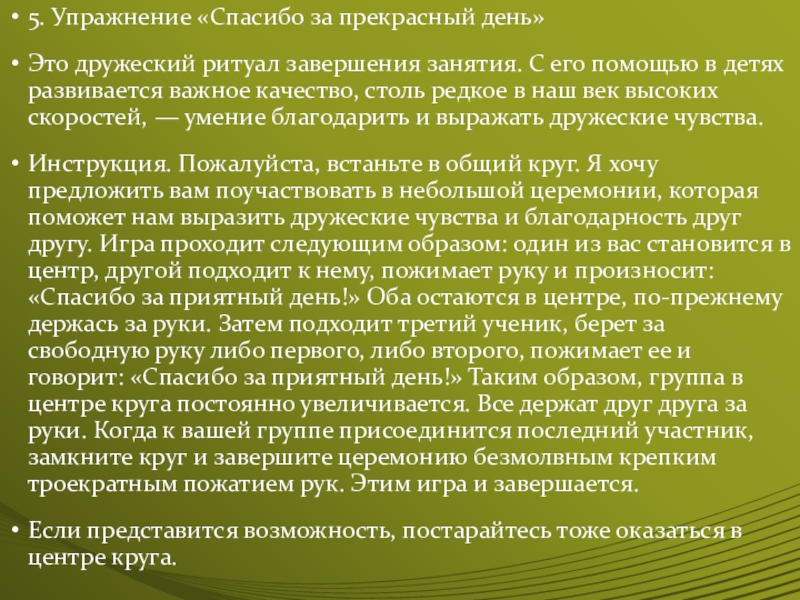 Инструкция. Пожалуйста, встаньте в общий круг. Я хочу предложить вам поучаствовать в небольшой церемонии, которая поможет нам выразить дружеские чувства и благодарность друг другу. Игра проходит следующим образом: один из вас становится в центр, другой подходит к нему, пожимает руку и произносит: «Спасибо за приятный день!» Оба остаются в центре, по-прежнему держась за руки. Затем подходит третий ученик, берет за свободную руку либо первого, либо второго, пожимает ее и говорит: «Спасибо за приятный день!» Таким образом, группа в центре круга постоянно увеличивается. Все держат друг друга за руки. Когда к вашей группе присоединится последний участник, замкните круг и завершите церемонию безмолвным крепким троекратным пожатием рук. Этим игра и завершается.