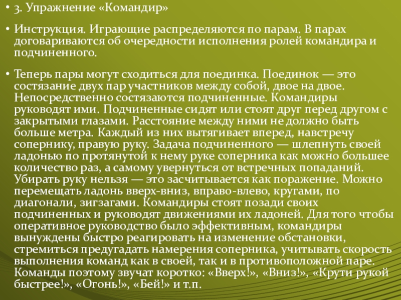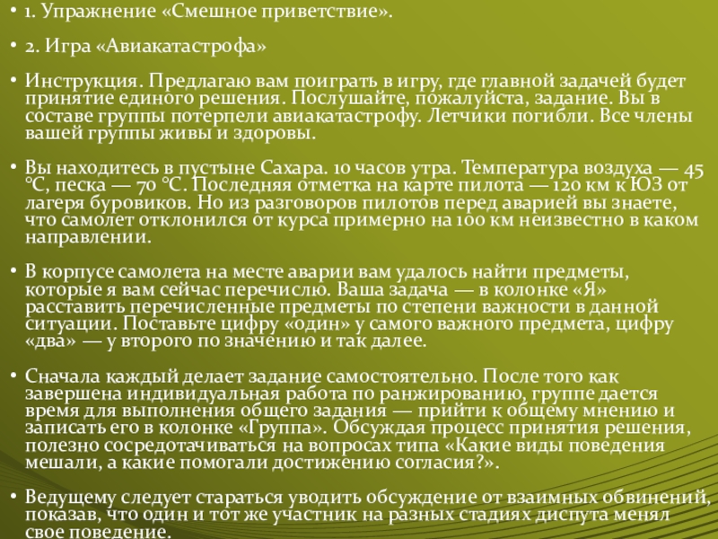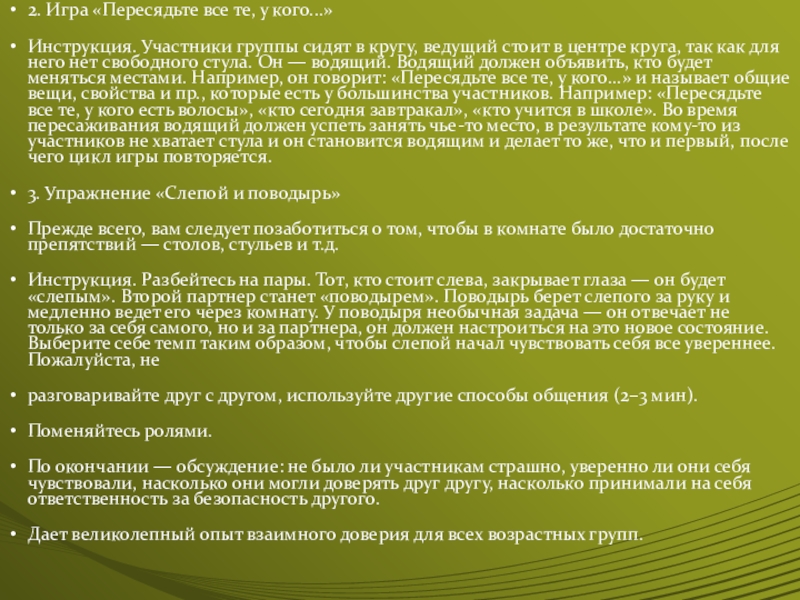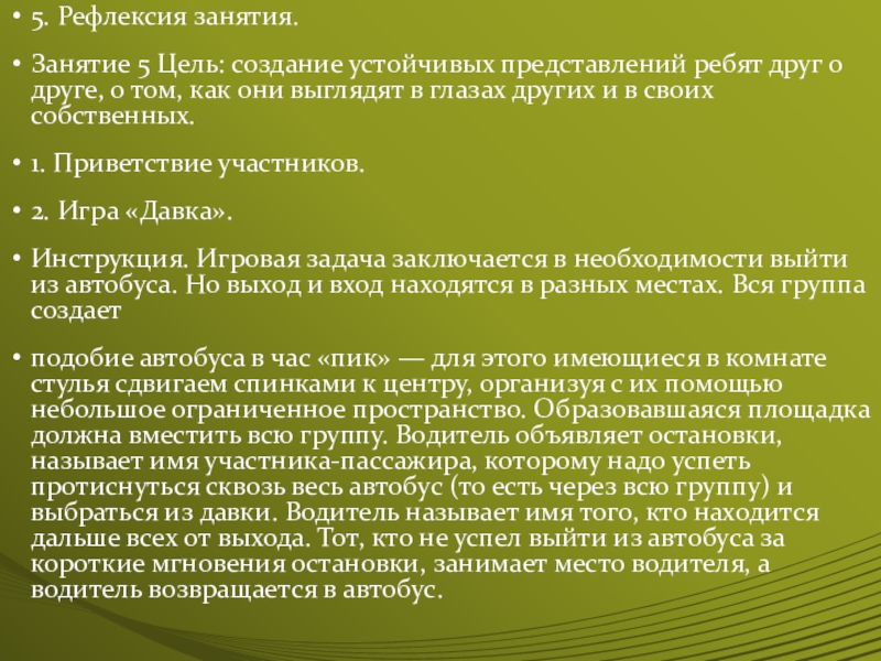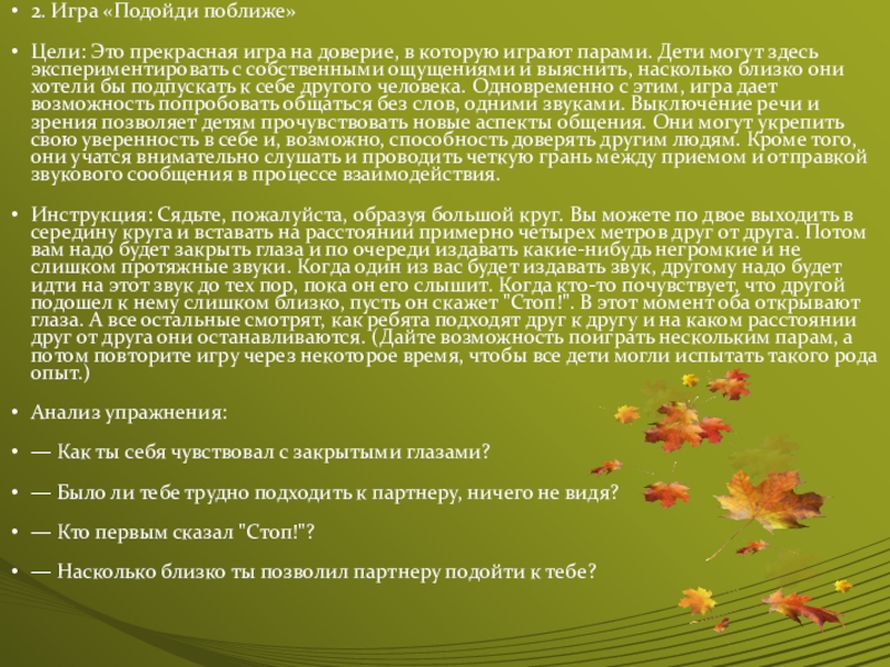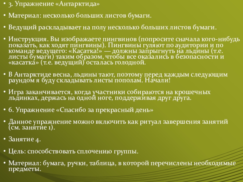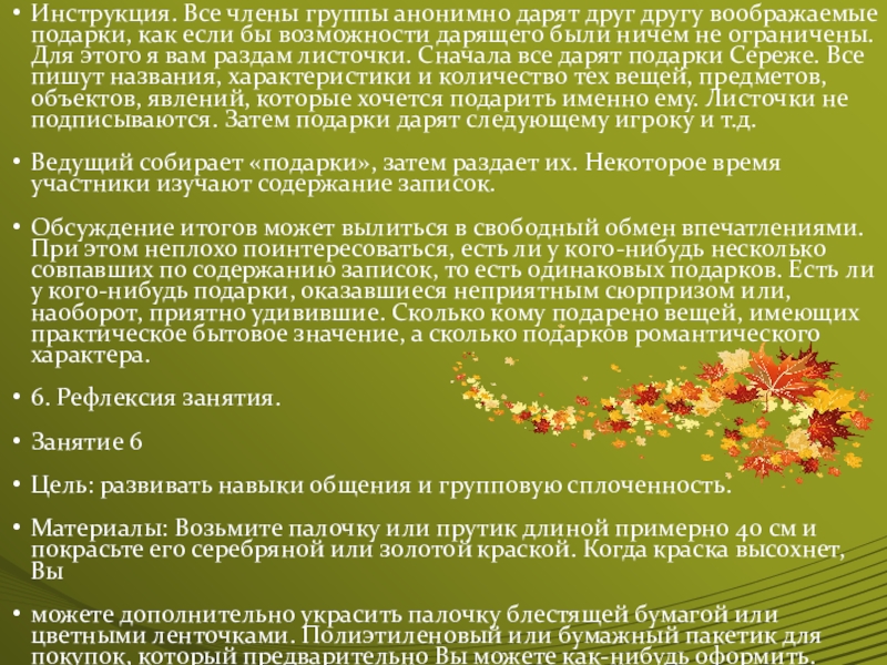 Инструкция. Пожалуйста, встаньте в общий круг. Я хочу предложить вам поучаствовать в небольшой церемонии, которая поможет нам выразить дружеские чувства и благодарность друг другу. Игра проходит следующим образом: один из вас становится в центр, другой подходит к нему, пожимает руку и произносит: «Спасибо за приятный день!» Оба остаются в центре, по-прежнему держась за руки. Затем подходит третий ученик, берет за свободную руку либо первого, либо второго, пожимает ее и говорит: «Спасибо за приятный день!» Таким образом, группа в центре круга постоянно увеличивается. Все держат друг друга за руки. Когда к вашей группе присоединится последний участник, замкните круг и завершите церемонию безмолвным крепким троекратным пожатием рук. Этим игра и завершается.