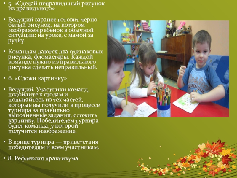 Командам даются два одинаковых рисунка, фломастеры. Каждой команде нужно из правильного рисунка сделать неправильный.