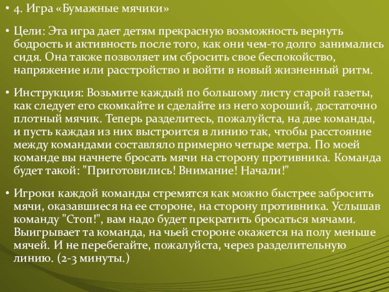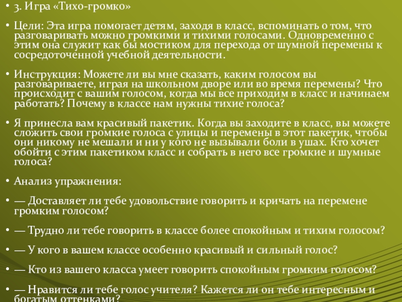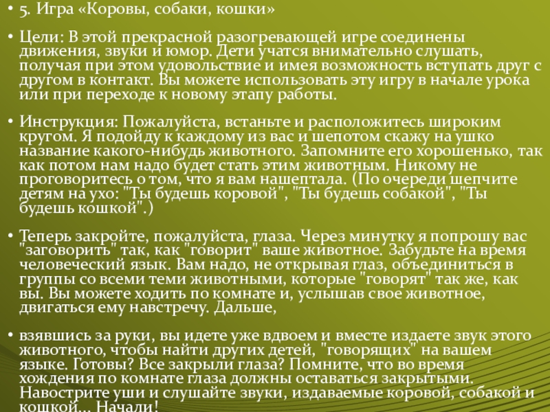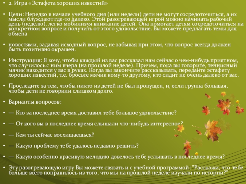 недели) дети не могут сосредоточиться, а их мысли блуждают где-то далеко. Этой разогревающей игрой можно начинать рабочий день (неделю), легко мобилизуя внимание детей. Она помогает детям сосредоточиться на конкретном вопросе и получить от этого удовольствие. Вы можете предлагать темы для обмена