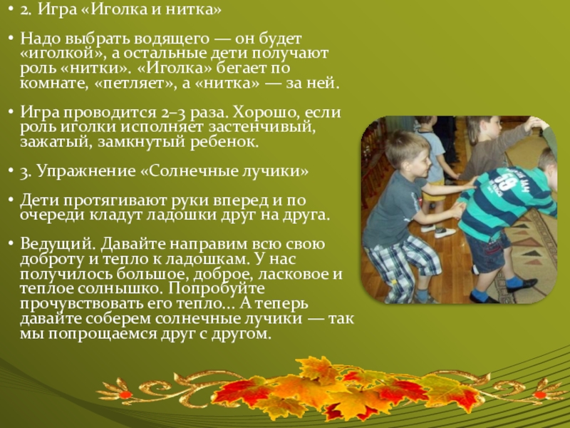 Игра проводится 2–3 раза. Хорошо, если роль иголки исполняет застенчивый, зажатый, замкнутый ребенок.