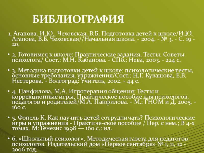 1. Агапова, И.Ю., Чеховская, В.Б. Подготовка детей к школе/И.Ю. Агапова,