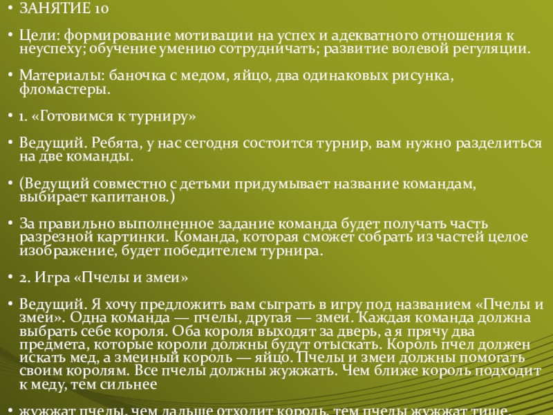 Ведущий. Я хочу предложить вам сыграть в игру под названием «Пчелы и змеи». Одна команда — пчелы, другая — змеи. Каждая команда должна выбрать себе короля. Оба короля выходят за дверь, а я прячу два предмета, которые короли должны будут отыскать. Король пчел должен искать мед, а змеиный король — яйцо. Пчелы и змеи должны помогать своим королям. Все пчелы должны жужжать. Чем ближе король подходит к меду, тем сильнее