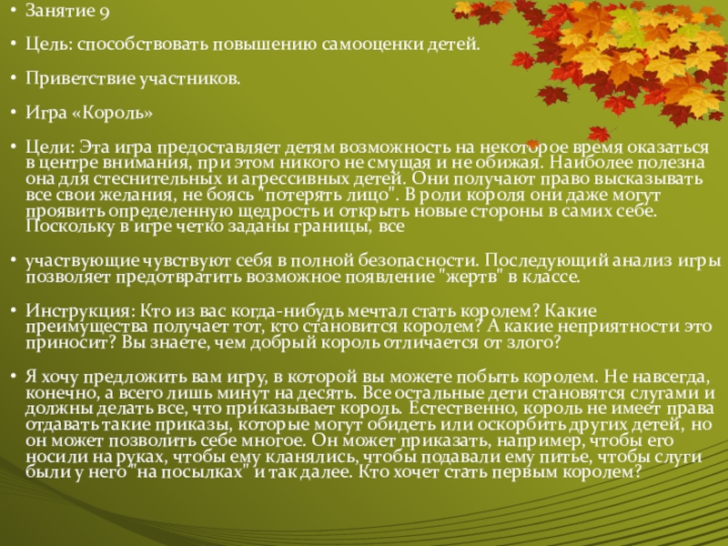 Я хочу предложить вам игру, в которой вы можете побыть королем. Не навсегда, конечно, а всего лишь минут на десять. Все остальные дети становятся слугами и должны делать все, что приказывает король. Естественно, король не имеет права отдавать такие приказы, которые могут обидеть или оскорбить других детей, но он может позволить себе многое. Он может приказать, например, чтобы его носили на руках, чтобы ему кланялись, чтобы подавали ему питье, чтобы слуги были у него "на посылках" и так далее. Кто хочет стать первым королем?