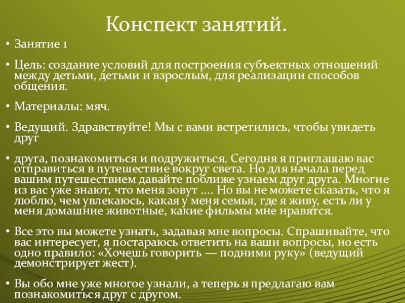 называет опорное слово (например: «Имя», «Семья» и др.), а дети должны задавать вопросы, кидая мяч любому участнику. В конце игры ведущий дает время для свободного обмена вопросами.