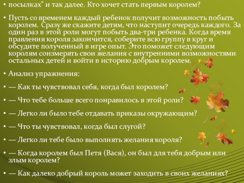 каждый ребенок получит возможность побыть королем. Сразу же скажите детям, что наступит очередь каждого. За один раз в этой роли могут побыть два-три ребенка. Когда время правления короля закончится, соберите всю группу в круг и обсудите полученный в игре опыт. Это поможет следующим королям соизмерять свои желания с внутренними возможностями остальных детей и войти в историю добрым королем.