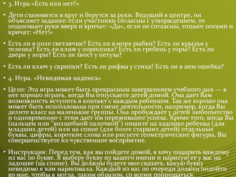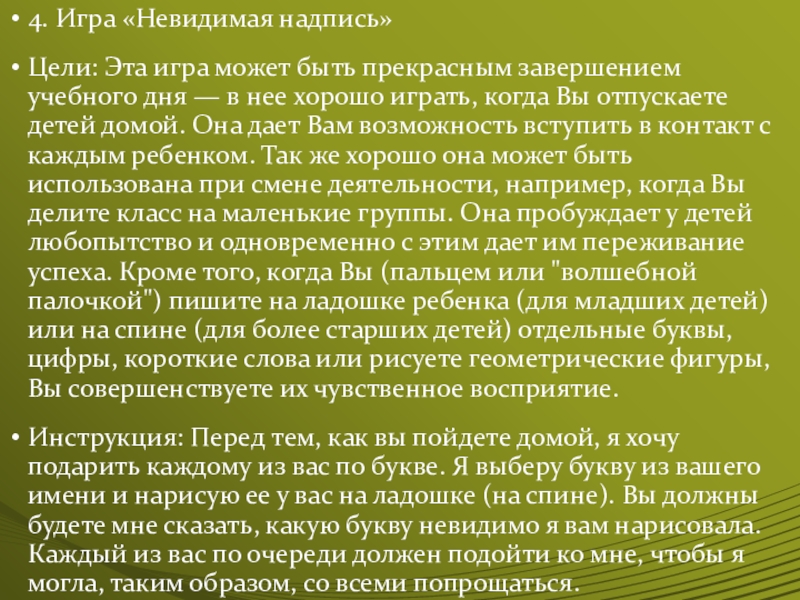 Цели: Эта игра может быть прекрасным завершением учебного дня — в нее хорошо играть, когда Вы отпускаете детей домой. Она дает Вам возможность вступить в контакт с каждым ребенком. Так же хорошо она может быть использована при смене деятельности, например, когда Вы делите класс на маленькие группы. Она пробуждает у детей любопытство и одновременно с этим дает им переживание успеха. Кроме того, когда Вы (пальцем или "волшебной палочкой") пишите на ладошке ребенка (для младших детей) или на спине (для более старших детей) отдельные буквы, цифры, короткие слова или рисуете геометрические фигуры, Вы совершенствуете их чувственное восприятие.