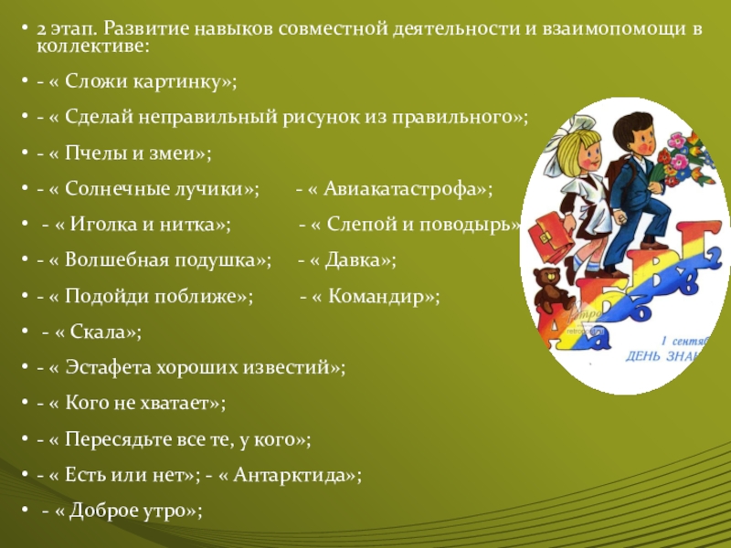 Слайд 62 этап. Развитие навыков совместной деятельности и взаимопомощи в коллективе: