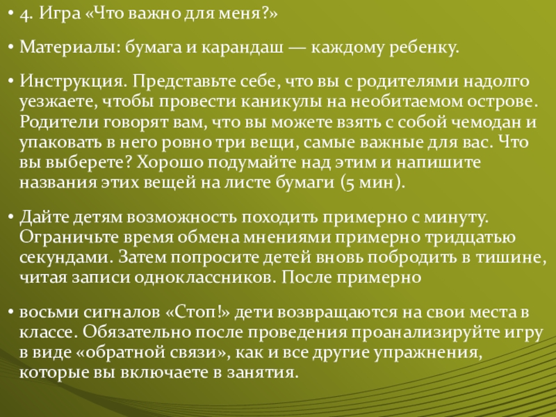Инструкция. Представьте себе, что вы с родителями надолго уезжаете, чтобы провести каникулы на необитаемом острове. Родители говорят вам, что вы можете взять с собой чемодан и упаковать в него ровно три вещи, самые важные для вас. Что вы выберете? Хорошо подумайте над этим и напишите названия этих вещей на листе бумаги (5 мин).