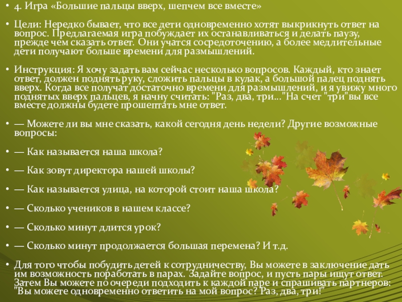 Проследите за тем, чтобы никто из детей не был пропущен, и, если группа большая, чтобы дети не говорили слишком долго.