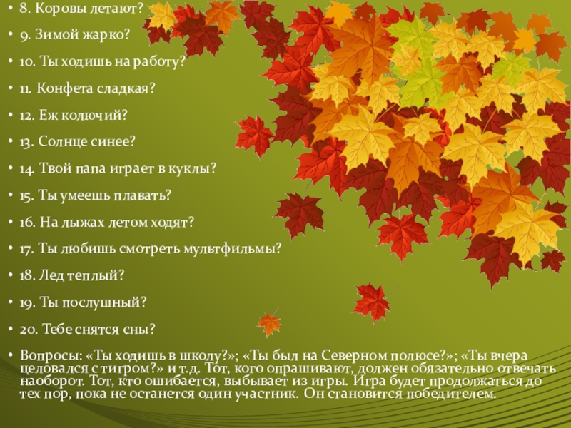 Вопросы: «Ты ходишь в школу?»; «Ты был на Северном полюсе?»; «Ты вчера целовался с тигром?» и т.д. Тот, кого опрашивают, должен обязательно отвечать наоборот. Тот, кто ошибается, выбывает из игры. Игра будет продолжаться до тех пор, пока не останется один участник. Он становится победителем.