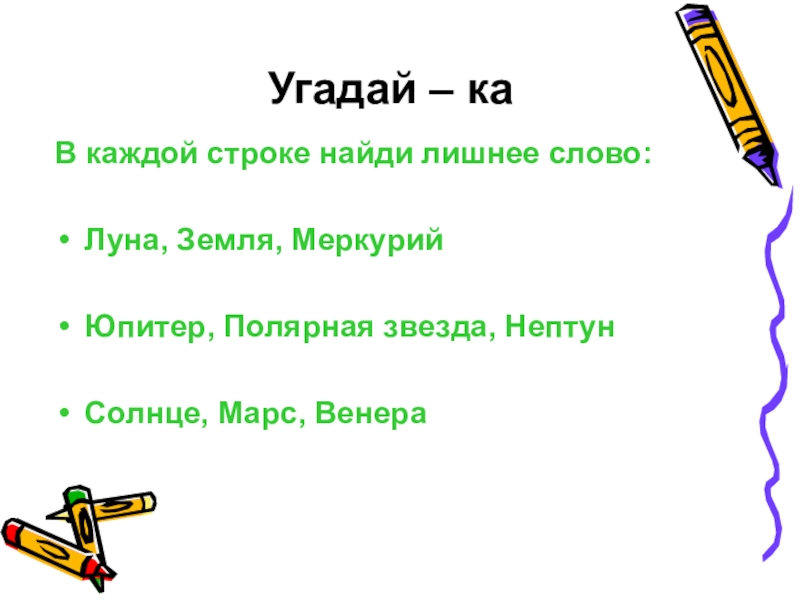 Угадай – каВ каждой строке найди лишнее слово:Луна, Земля, МеркурийЮпитер, Полярная звезда, НептунСолнце, Марс, Венера