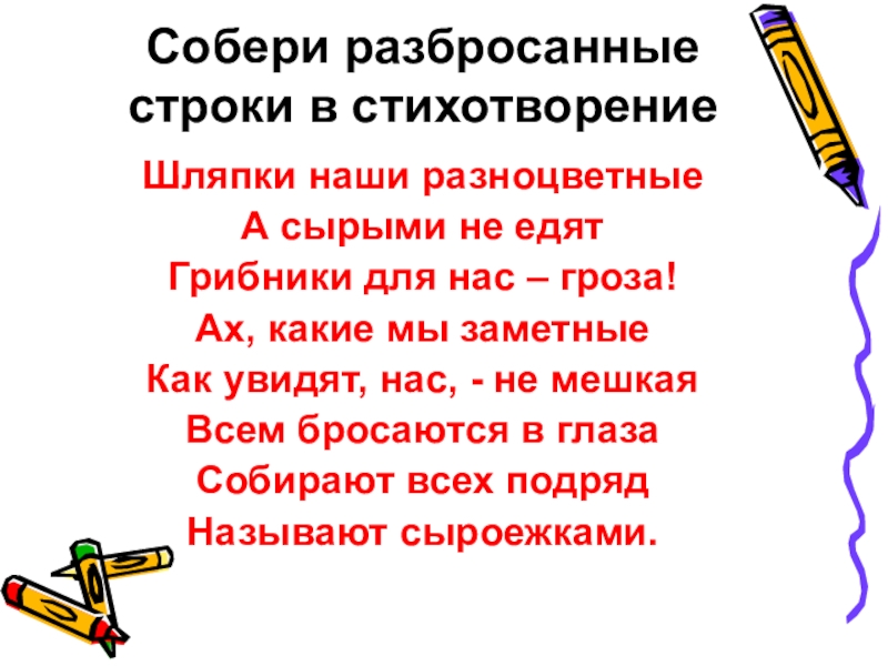 Собери разбросанные строки в стихотворениеШляпки наши разноцветныеА сырыми не едятГрибники для нас – гроза!Ах, какие мы заметныеКак