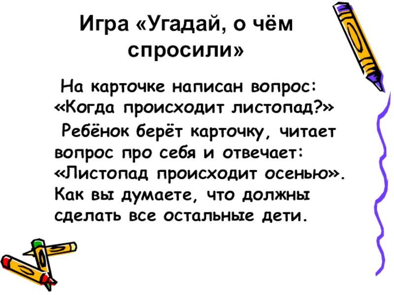 Игра «Угадай, о чём спросили»  На карточке написан вопрос: «Когда происходит листопад?»  Ребёнок берёт карточку,