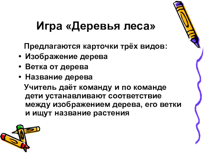 Игра «Деревья леса»  Предлагаются карточки трёх видов: Изображение дереваВетка от дереваНазвание дерева  Учитель даёт команду