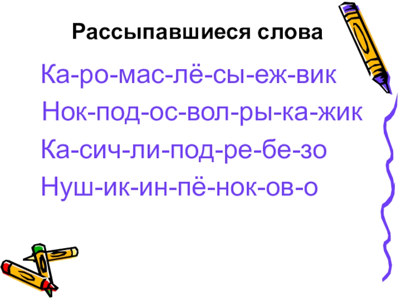 Рассыпавшиеся словаКа-ро-мас-лё-сы-еж-викНок-под-ос-вол-ры-ка-жикКа-сич-ли-под-ре-бе-зоНуш-ик-ин-пё-нок-ов-о