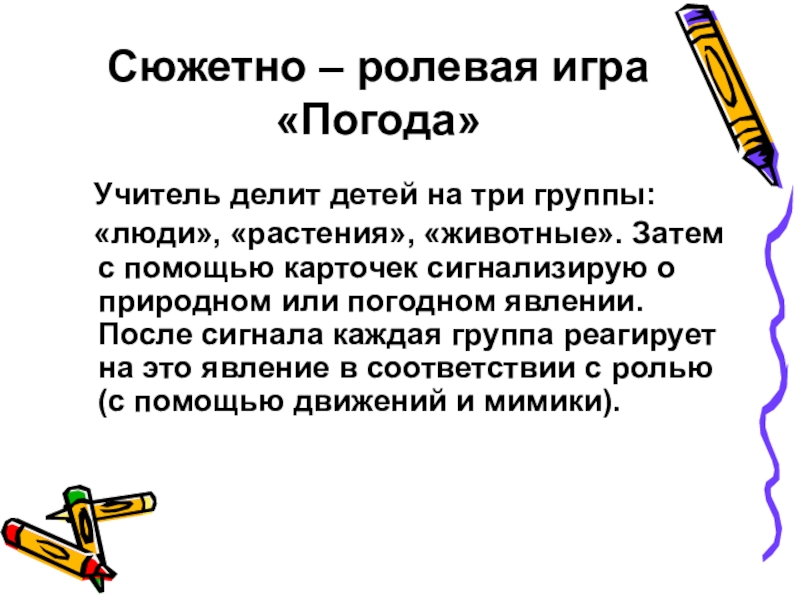 Сюжетно – ролевая игра «Погода»  Учитель делит детей на три группы:  «люди», «растения», «животные». Затем