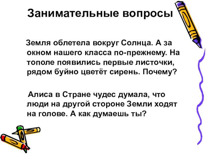 Занимательные вопросы  Земля облетела вокруг Солнца. А за окном нашего класса по-прежнему. На тополе появились первые