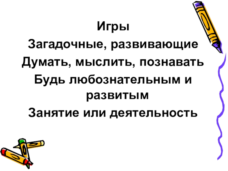 ИгрыЗагадочные, развивающиеДумать, мыслить, познаватьБудь любознательным и развитымЗанятие или деятельность